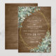 Buquês de aquarela eucalipto verde decoram a estrutura geométrica dourada neste convite de casamento russo de madeira, com o texto em modernas fontes elegantes, e fundo de madeira rústica.