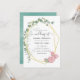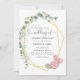 Trendy geométrico eucalipto verde e rosas cor-de-rosa pinceladas convite para casamento com moldura geométrica dourada e lavagem de cor d'água da menta inversa.