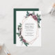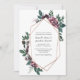 Moldura geométrica de ouro rosa rodeada por flores aquáticas e verde-verde em cores de burgundy, cinza e verde-negro. A parte de trás da carta é verde-escuro. As caixas de texto são fáceis de personalizar com suas próprias informações.