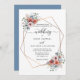 Nosso elegante convite de casamento mostra seus detalhes de casamento... estrutura de ouro geométrica dentro com buquês florais de cor d'água pintados à mão. Flores em tons azuis, cor-de-rosa-pincel, pêssego, marfim, azuis e poeirentos. Uso de graciosos detalhes caligraficos escritos à mão. Traseira do cartão em elegante tom azul empoeirado. Parte da nossa coleção de casamento e eventos "Blissful Floral".