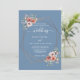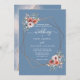 Nosso elegante convite de casamento azul mostra seus detalhes de casamento... o quadro de ouro geométrico do dentro com buquês florais de cor d'água pintados manualmente. Flores em tons azuis, cor-de-rosa-pincel, pêssego, marfim, azuis e poeirentos. Uso de graciosos detalhes caligraficos escritos à mão. Traseira da carta em sofisticada pincel, ouro e textura de tinta suave azul empoeirada. Parte da nossa coleção de casamento e eventos "Blissful Floral".