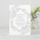 Cor maravilhosa e design geométrica fazem este convite atordoante. Este design apresenta um esquema monocromático de cores em lindos tons verdes e suaves, uma adorável linha botânica floral desenhada, e tipografia personalizada com uma borda geométrica na frente. O verso apresenta uma lindíssima tapeçaria floral.