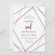 Estes convites contemporâneos do casamento caracterizam um esquema de cores americano patriótico em linhas geométricas vermelhas e azuis no branco. Aperfeiçoe para seu quarto do casamento de julho ou de todo o casamento americano.