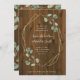 Este eucalipto romântico da aguarela das características rústicas e na moda do convite do casamento sae e folha em um quadro center geométrico do ouro do falso. O fundo é feito para olhar como a madeira marrom rústica. Há um espaço na parte inferior com a opção para adicionar seu Web site do casamento. Um simples contudo um impressionante procuram seu casamento moderno.