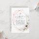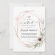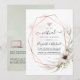Convite online de cerimônia virtual de casamento de longa distância, com flores anêmonas e folhas de eucalipto em um quadro geométrico de ouro rosa.