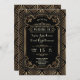 Design Glamouroso e Romântico no estilo Great Gatsby Art Deco. Apresenta estilo Art Deco, forma em folha de ouro falso e ornamentos, fontes vintage deslumbrantes, em um fundo preto. Use a ferramenta Personalizar para adicionar suas informações. Para itens correspondentes, visite minha Coleção Art Deco Preto/Branco Gatsby Estilo 1920.