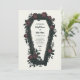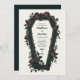 Muito bonito, este convite de casamento de caixão é perfeito para um casamento gótico ou de Halloween. Coffin tem rosas ao redor das bordas. A tipografia caligráfica escrita à mão aumenta a aparência. Veja a coordenação de itens no nosso compro, Encantado Finch.
