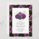 Convite de casamento gótico com rosas e crânios em sotaques de preto, roxo e ouro personalizáveis para suas especificidades de evento.