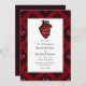 Convite de casamento gótico vermelho com coração e um padrão de rosa dramático.