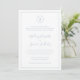 Simples convite de casamento azul empoeirado com seu monograma em um círculo no topo e seus detalhes de casamento cercados por uma borda fina. Seus nomes estão em uma fonte elegante de script manuscrito. O esquema clássico e tradicional faz este excelente de convite para um casamento formal.