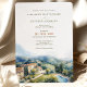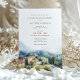 Esse belo convite de casamento captura a essência de uma celebração romântica no histórico Castello di Petrata em Assisi, Itália. A frente do convite apresenta uma ilustração, belamente feita em aquarela, do majestoso Castello, rodeado por vinhedos exuberantes e por um céu azul claro, evocando o ambiente sereno do campo italiano. A paleta de cores é uma mistura harmoniosa de azul-céu azul-claro, branco-nuvem-suave, verde-videira rico e os tons de terra quente das paredes de pedra de Castello. Abaixo da imagem, os detalhes do convite são apresentados elegantemente em uma fonte serif clássica, com os nomes do casal exibidos de forma proeminente. O uso de roteiro para os cabeçalhos adiciona um toque de sofisticação, enquanto a data se destaca num tom espetacular. Este convite é perfeito para casais que buscam um toque de charme e elegância italianos em sua papelaria de casamento.