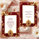 Um cartão de casamento indígena marrom elegante para a cerimônia de Mehndi (mehandi). O design tem motivos florais de ouro na fronteira e um modelo correspondente para o contrário. O texto usado tem tipografia moderna e pode ser facilmente personalizado. Uma cerimônia em Mehandi pertence aos costumes e rituais feitos antes do casando e trocando votos do casamento indiano.