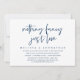 Cartão de convite de casamento com tema Moderno Script Azul-Marinho (Nada de Luxo, Apenas Amor). É perfeito para o seu casamento informal à beira do lago, jantar, dança e festa.