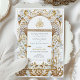 Este convite ao casamento islâmico harmoniza lindamente os elementos tradicionais com o estilo Art Nouveau. A frente do convite mostra uma magnífica arquiduque adornada com folhas falsas de ouro e flores brancas, incluindo o ouro Bismillah Árabe, simbolizando o início de uma união abençoada. O reverso apresenta uma delicada árvore ouro, entalando as iniciais em suas raízes, significando a vida interligada do casal. A paleta de cores é uma combinação luxuosa de ouro de champanhe, branco cremoso e toques macios de caramelo e bronze, que proporciona um apelo vintage mas eterno. Este convite é um anúncio perfeito para casais que apreciam a mistura do significado cultural e da elegância artística.