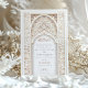 Este luxuoso convite para o casamento é uma mistura perfeita da arte tradicional islâmica e da elegância moderna. Na parte da frente do convite está um intrincado padrão floral de ouro e marfim, que deliciosamente enquadra o texto em árabe e inglês. O belo design de arco, adornado com detalhes de motivos florais e padrões geométricos, expele um senso de grandiosidade e sofisticação. O verso do convite prossegue esse tema com um fundo bege suave, destacado por um ornamentado floral gravado, que adiciona textura e profundidade. Ideal para um grande e elegante casamento, este convite deixa uma impressão duradoura para os seus convidados.