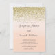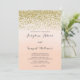 Convite de casamento com design dourado falso e fundo aquarela cor de pêssego.