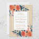 Este design de convite para o casamento mostra flores laranja-aquática e folhagem azul num lindo fundo creme.