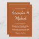 Elegante convite de casamento para a tipografia da moda em um simples monocromático pôr do sol laranja enferrujado e letras brancas de mão com nomes de noiva e noivo escovados com roteiro de caligrafia. ++++++++++++++++++++++ Você pode alterar as cores do texto e do plano de fundo após selecionar a opção PERSONALIZAR mais. +++++++++ O convite é adequado para recepções de casamento de estilo moderno.