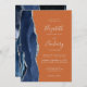 A borda esquerda deste elegante convite de casamento moderno apresenta um marinho azul de aquarela agata bordada com falso brilho prateado. O texto personalizável combina manuscrito, fontes copperplate e itálico em cinzas prateadas leves em um fundo laranja queimado. O verso apresenta um design azul marinho e agate prateado correspondentes.