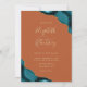 Uma cor azul-lacrimogênea agate design aparada com brilho de ouro falso aparece em dois cantos deste design elegante. Personalize-o com os nomes dos casais em um guião de escrita manual dourada sobre um grande e grande. Adicione os detalhes do casamento em uma placa colorida dourada e fontes itálicas em um fundo laranja queimado. O verso apresenta um design de chaleira e de agata dourada.