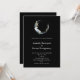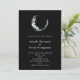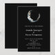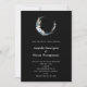 Um convite de casamento com uma ilustração mística. Uma lua crescente azul escura com um contorno circular fino e elegante e flores brancas ao longo de suas bordas.
