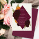 Este é um convite de casamento elegante com uma paleta de cor de burgundy e creme. A característica principal é uma forma grande e profunda de diamante de burgundy que contém os detalhes do casamento. O design é emoldurado por flores aquáticas, lentas, em tons ricos de burgundy e ouro amarelos, com sotaques de folhagem verdes. A estética global é sofisticada e contemporânea, fazer adequada para um casamento formal ou semissformal no outono.