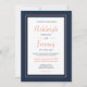 Este design simples, clássico e minimalista apresenta os primeiros nomes da noiva e do noivo na fonte moderna de exibição de coral e o texto restante em marinho azul ou coral em um retângulo branco enquadrado por uma fina linha de coral. A borda/fundo e o verso são azuis marinhos sólidos.
