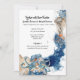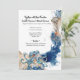 Uma bela ilustração em aquarela apresentando ondas marinhos de oceano azul e laranja através das quais um grande polvo e peixe-gelina estão nadando. Eles estão cercados por lamelas de laranja, ouro falso e espuma azul-do-mar. São ideais para o destino costeiro; Casamentos, chás de fraldas e aniversários do tema da ilha tropical e praia. Personalize os modelos que cobrir a recepção, o alojamento, as medidas de segurança do código 19 e os detalhes do seu website de RSVP.