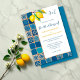 Este elegante convite de casamento italiano-mediterrânico apresenta azulejos cerâmicos e ilustração aquosa de limões suculentos de limões frescos pintados com um belo toucinho azul mediterrânico.