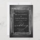 Um convite de casamento metálico com um metal turvo escuro com quadros pretos e prateados.