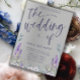 Modelo de convite para casamento moderno com letra elegante escrita à mão em roxo num fundo metálico prateado. Apresenta também trabalho de arte de lavanda, eucaliputo e flores roxas de cor d'água original. Personalize o texto para criar algo realmente exclusivo.