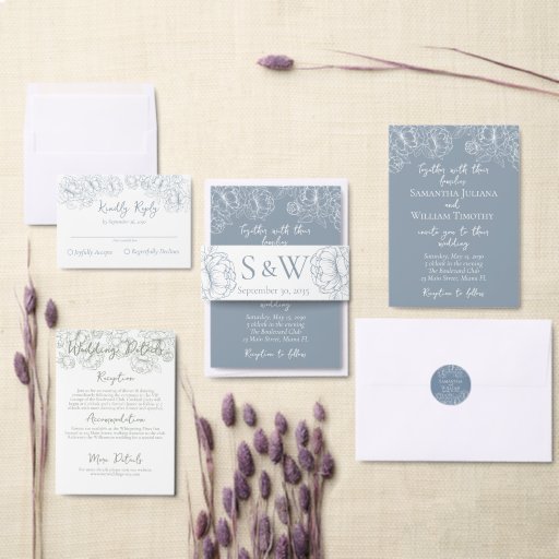 Convite botânico floral elegante para casamento floral com iniciais no verso. Belo desenho de safra de peões brancos, colocado sobre um fundo azul empoeirado com roteiro branco e letras em negrito com um repetido desenho azul empoeirado de peões sobre um fundo branco clássico. Mantenha os textos genéricos e personalize com seus nomes e a data ou use seu próprio texto. Design minimalista elegante com um sentimento romântico de feitiço. Código QR incluído para direcionar seus hóspedes diretamente para seu site de casamento. Se precisar de ajuda para fazer de quaisquer alterações, envie-me um e-mail para desigsbykatz@gmail.com e terei todo o prazer em ajudar.