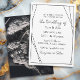 Simples convites de casamento minimalistas, preto e branco, com linhas geométricas. O fundo é um gráfico de couro e renda.