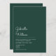 Convite de casamento minimalista com um design clássico que mostra os nomes dos casais felizes, em um roteiro elegante acima dos detalhes especiais de casamento em um fundo verde esmeralda. Projetado por Thisnotme©