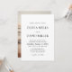 Um design de convite para casamento elegante e na moda com um layout moderno em um tema elegante minimalista preto e branco. O convite mostra linhas limpas e um layout de tipografia sofisticado, usando fontes ousadas sans-serif emparelhadas com sotaques sutis de script. A arca serve como a peça central, com detalhes chave do casamento, como os nomes do casal e a data do evento exibidos de forma destacada. O design enfatiza a simplicidade e o refinamento, usando alto contraste e espaço negativo para criar um eterno e aparência contemporânea. Perfeito para casais que buscam uma estética moderna e química para seu dia especial.