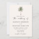 Convites tropicais de casamento com ilustração de palmeira de solteiro no topo do convite com fundo de marfim. Personalize os convites de casamento das palmeiras com seus nomes e detalhes de casamento em letras negras com um moderno script com letra de mão destacando o design. O simples convite de casamento tropical se inverte para exibir um fundo verde sólido. Projetado para coordenar com a nossa coleção de casamento da Palm Tree Minimal.