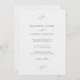 Convite de casamento minimalista baseado em tipografia elegante, com fundo branco de pelúcia e padrão paisley esbranquiçado e tipografia clássica de cinza escura com sotaque floral botânico.