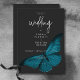 Este design de convite para o casamento apresenta um tema escuro e melancólico que é simples, mas atordoante. Um fundo negro de carvão negro é a canvas perfeita para uma mariposa azul-azul-lacrimejante solteiro, suas asas se espalham para o voo. Único e elegante, este design pode ser usado em qualquer estação. Criado pela imprensa simplesmente de farmácia.