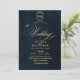 O elegante convite de casamento azul-na moda e ouro moderno, com uma elegante fonte manuscrita com caracóis e um monograma da noiva e do noivo. Clássico e elegante, simples e moderno convite.