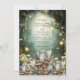 Um convite místico para casamento florestal, com uma floresta mágica de cogumelos com cristais e luzes místicas brilhantes.