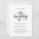 Este elegante convite de casamento azul e branco é perfeito para um casamento moderno. O simples design apresenta uma elegante caligrafia azul marinho sobre um fundo branco limpo. O cartão de convite inclui os detalhes do casamento no verso, em vez de pagar um cartão separado.