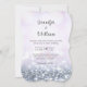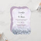 Convite de casamento elegante com letra cursiva roxa lavanda e brilho prateado.