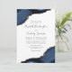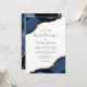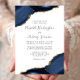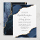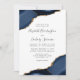Este convite de casamento moderno e elegante apresenta um design de ágata em aquarela azul marinho decorado com brilho dourado falso em dois cantos. O texto personalizável combina fontes manuscritas, copperplate e itálicas em cinza carvão sobre um fundo branco. O verso apresenta um design correspondente em azul marinho e ágata dourada.
