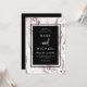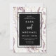 Esses convites de casamento modernos e elegantes apresentam um fundo com aparência de mármore roxo e branco com flocos de ouro falso espalhados. A área central contém uma moldura preta escura estilosa com a redação do convite em tipografia branca da moda.