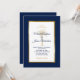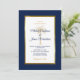 Convide seus hóspedes para ajudá-lo a celebrar seu dia especial com este elegante convite com textos modernos, azuis e dourados, incluindo palmeiras tropicais artísticas e moldura de ouro metálico na frente do cartão. Um fundo azul marinho está na frente e atrás.