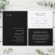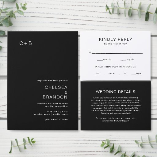Convite Moderno de Casamento com um layout simples e minimalista com seu monograma no canto superior esquerdo e seus detalhes de casamento no canto inferior direito. Todos os elementos de design estão em branco sobre um fundo preto e podem ser alterados na ferramenta de edição de design. Este convite de casamento chic com um design mínimo, mas elegante, vai bem com qualquer estilo de casamento contemporâneo.
