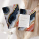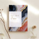 Convite de casamento contemporâneo com um quadrado branco no qual todas as suas informações estão elegantemente escritas em um fundo de mármore abstrato agate. Os detalhes agados estão em tons de laranja e azul com sotaques dourados. Veja na nossa loja mais itens desta coleção de casamento.