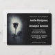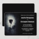 Um convite de casamento com aparência sombria e misteriosa com uma ilustração legal de uma rosa negra estilo goth/emo com sangue vermelho pingando de suas pétalas. Um fundo preto desgastado com uma cor creme no centro destacando essa rosa sombria e macabra.