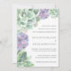 Convite de casamento botânico com água verde e púrpura suculenta no topo e à esquerda e seus detalhes em uma fonte de cinza macia. A parte de trás tem uma lavagem com aquarela verde. Os suculentos adicionam um elemento natural excelente ao design. Estes convites são perfeitos para um casamento no deserto na primavera ou no verão.
