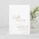 Um convite moderno de casamento em ouro falso, com um design simples e mínimo com o nome da noiva em um roteiro elegante e o nome do noivo em uma fonte contemporânea sans serif. Abaixo, no canto inferior direito, estão os detalhes do evento em um layout minimalista.